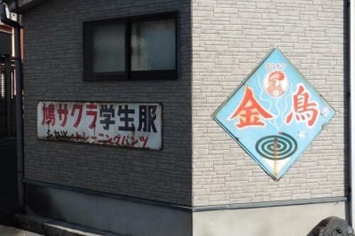 兵庫県加古川市 で 見つけた レトロ看板 居酒屋さん 「鳩サクラ学生服」 「金鳥」 その他の レトロ看板は こちら。。。 レトロ看板色々