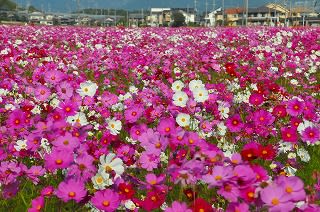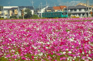 2015-10-31 加東市河高 コスモス畑 ぶらり散策(旅) 兵庫県加東市河高 コスモスは加東の市花です。 河高地区では、約2.5ヘクタールの転作田に 約100万本のコスモスが植えられいるそうです。。。 JR社町駅 の 北で、 加古川線 下り列車 とコスモス畑です。